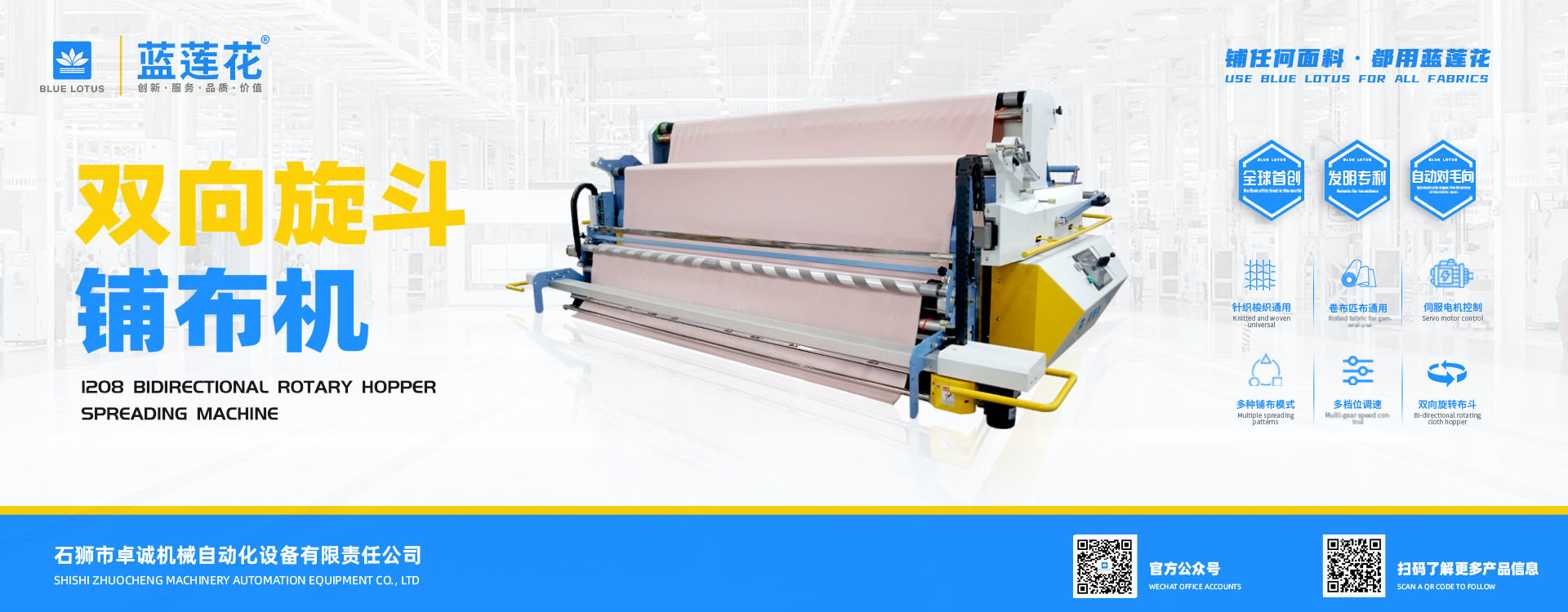 我司結合市場自主研發(fā)的藍蓮花品牌拉布機擁有多項自主專利技術,機器以小巧多功能易操作低維護為特點,為業(yè)界提供性價比機型。